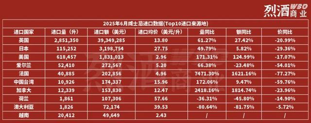 然而在6月的进口数据中,英国威士忌的进口量、额均大幅增长,这表明市场短期内有集中补货行为,可能与即将到来的中秋等销售节点相关。